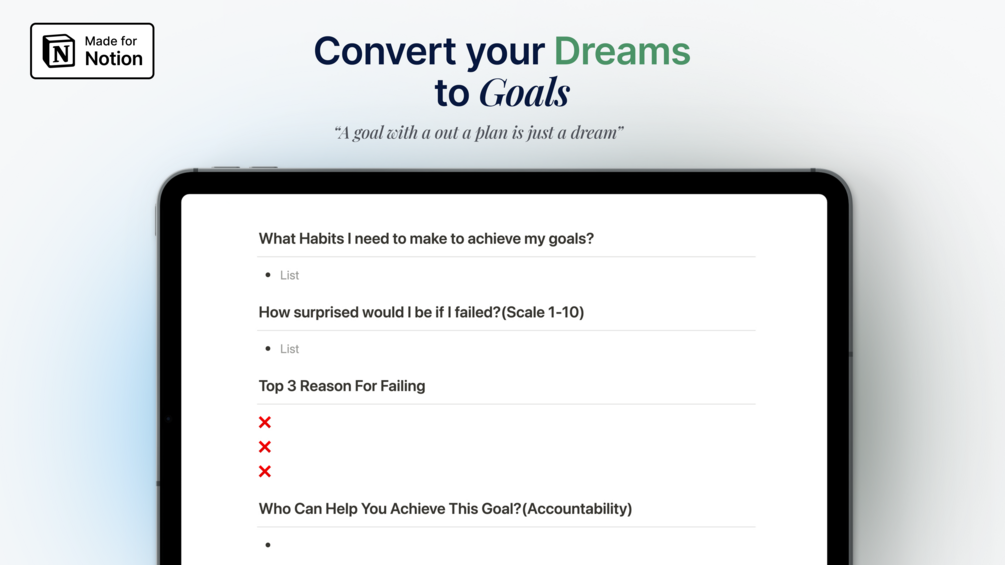 An all-in-one Notion template to set goals, evaluate them, and set & track habits to achieve them.